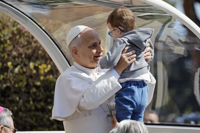 Pope Leo XIV blesses a child as he leaves the Cathedral of Monaco (Picture: EPA)